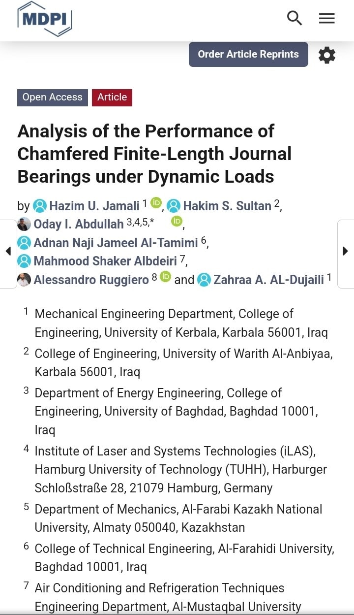 نشر أ.م.د. حاكم سماوي سلطان الجبوري من كلية الهندسة/ قسم هندسة التكييف والتبريد. بحثاً علمياً مشتركاً مع مجموعة من الباحثين في جامعات عالمية رصينة