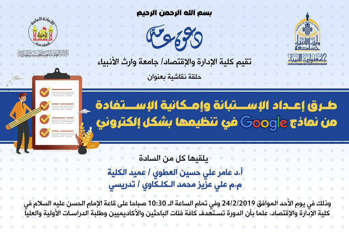 اقيمت في قاعة الامام الحسن -كلية الادارة والاقتصاد حلقة نقاشية بعنوان اعداد استمارة الاستبيان وكيفية استخدام نماذج Google في نشرها الكترونيا من قبل أ.د.عامر العطوي و م.م.علي عزيز وقد تضمنت الحلقة الاشارة الى العديد من المحاور المهمة التي تتعلق بمفهوم الاستبيان والية بناء الاستبيان والخطوات اللازم اتباعها من قبل باحثيين بالاضافة الى تقديم امثلة تطبيقية حول نماذج Google وقد شارك في الحلقة النقاشية المساعد العلمي لرئيس الجامعة أ.د.عباس الدعمي وتدريسي كلية الادارة والاقتصاد و عدد من تدريسي باقي الكليات وعدد من الطلبة