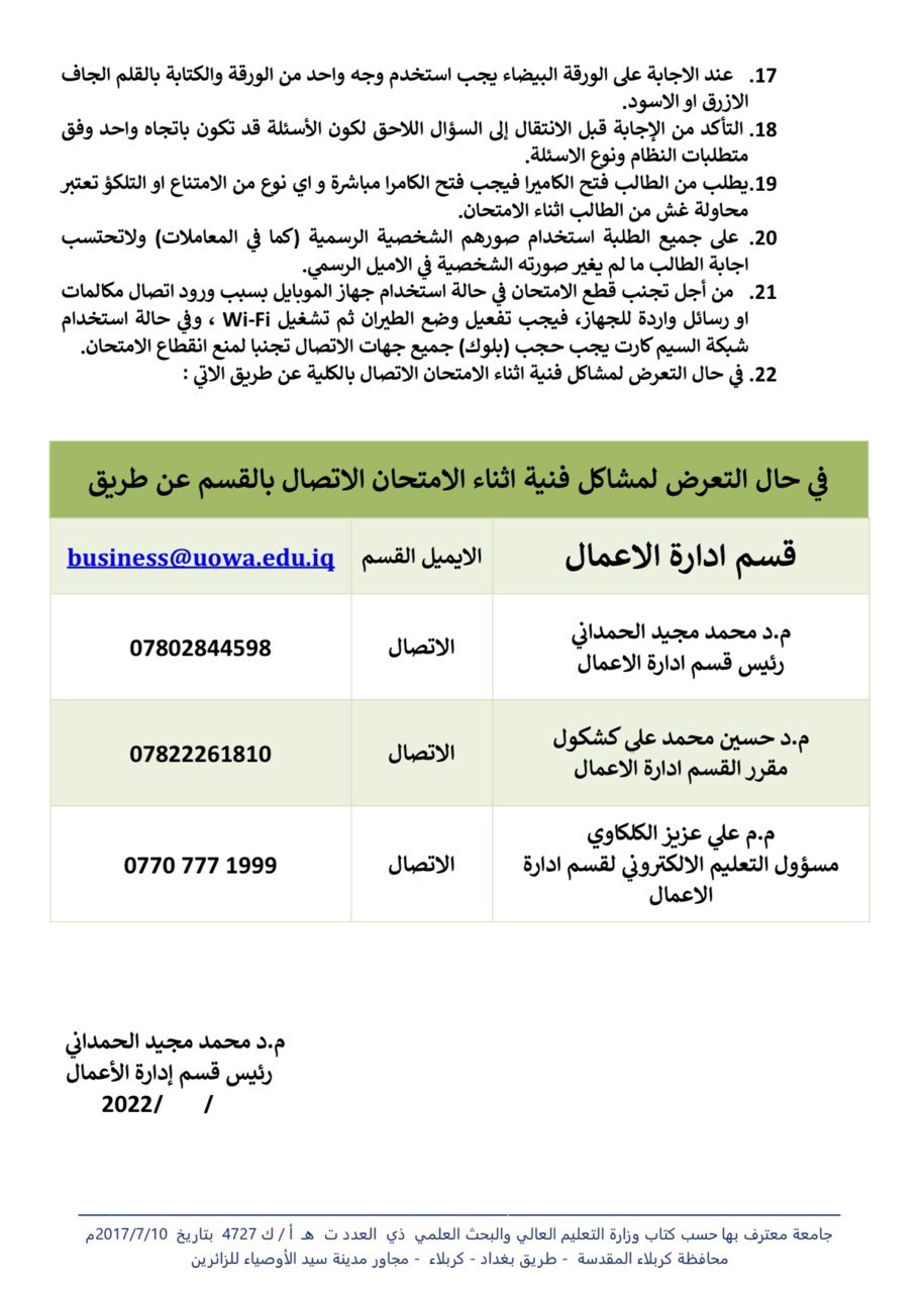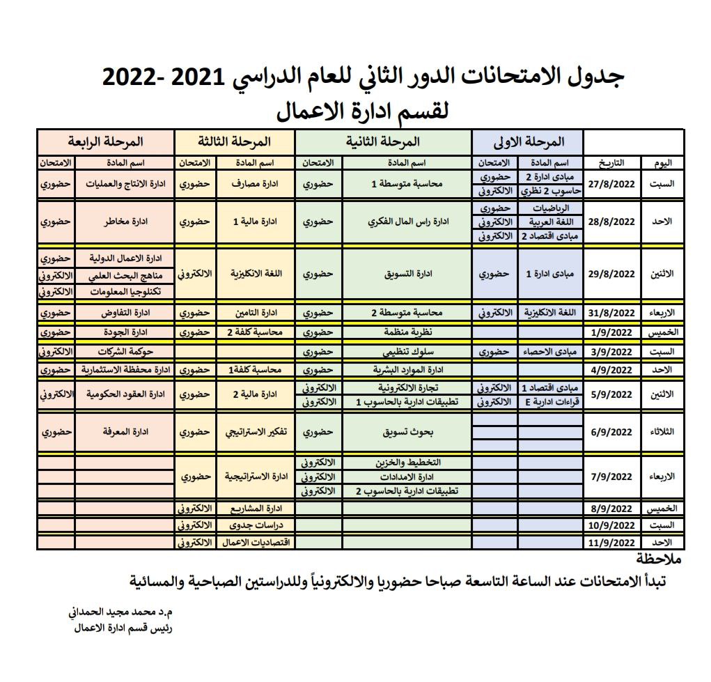 جدول امتحانات الدور الثاني لقسم ادارة الاعمال للعام الدراسي 2021-2022