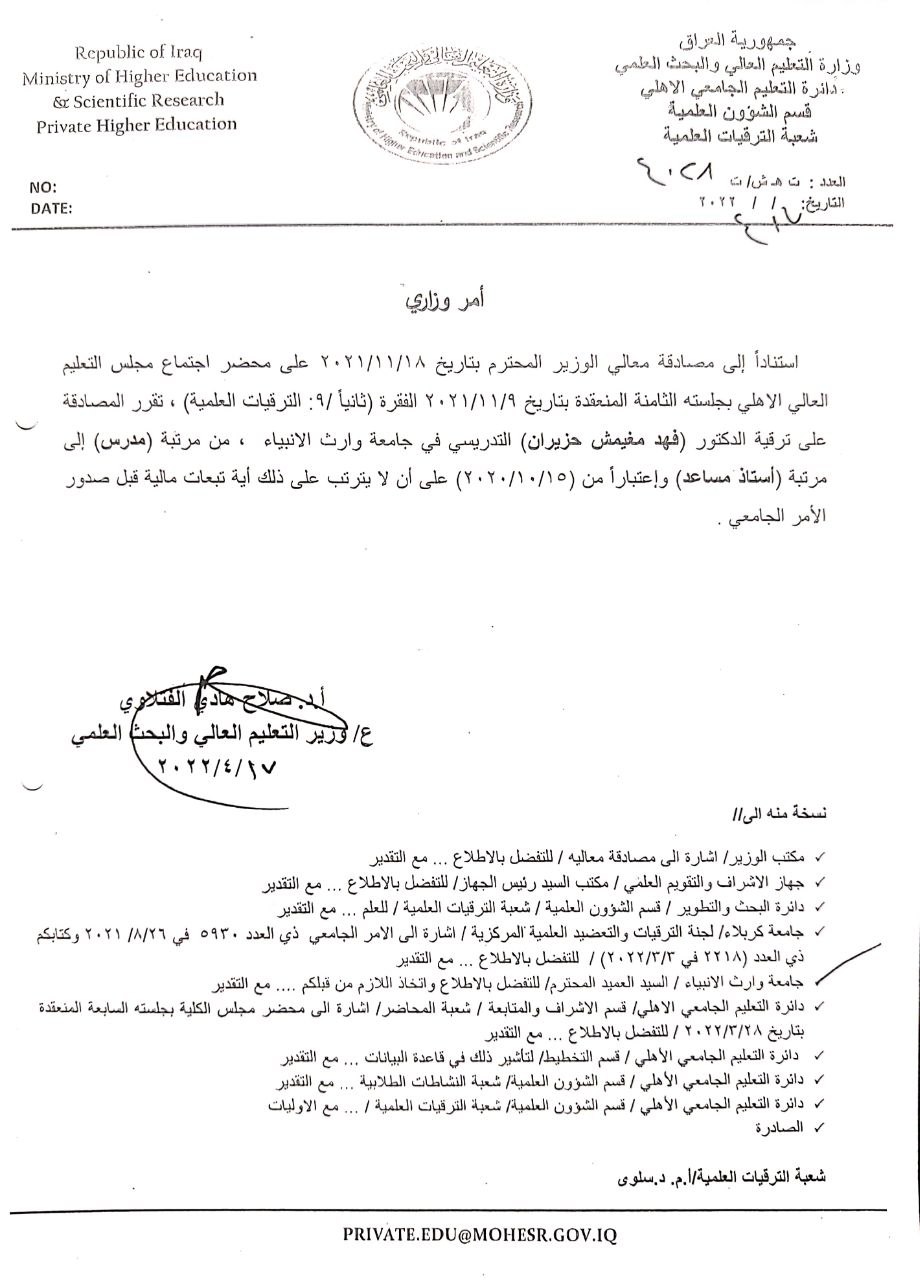 تتقدم عمادة كلية الادارة والاقتصاد واساتذتها بأزكى التهاني و التبريكات للدكتور فهد مغيمش الشمري معاون العميد للشؤون العلمية والادارية  بمناسبة صدور امر وزاري بالترقيته العلمية الى ( استاذ مساعد ) متمنين له دوام النجاح و الموفقية و التقدم و العطاء في سبيل اعلاء شأن العلم في كليتنا وجامعتنا العريقة.