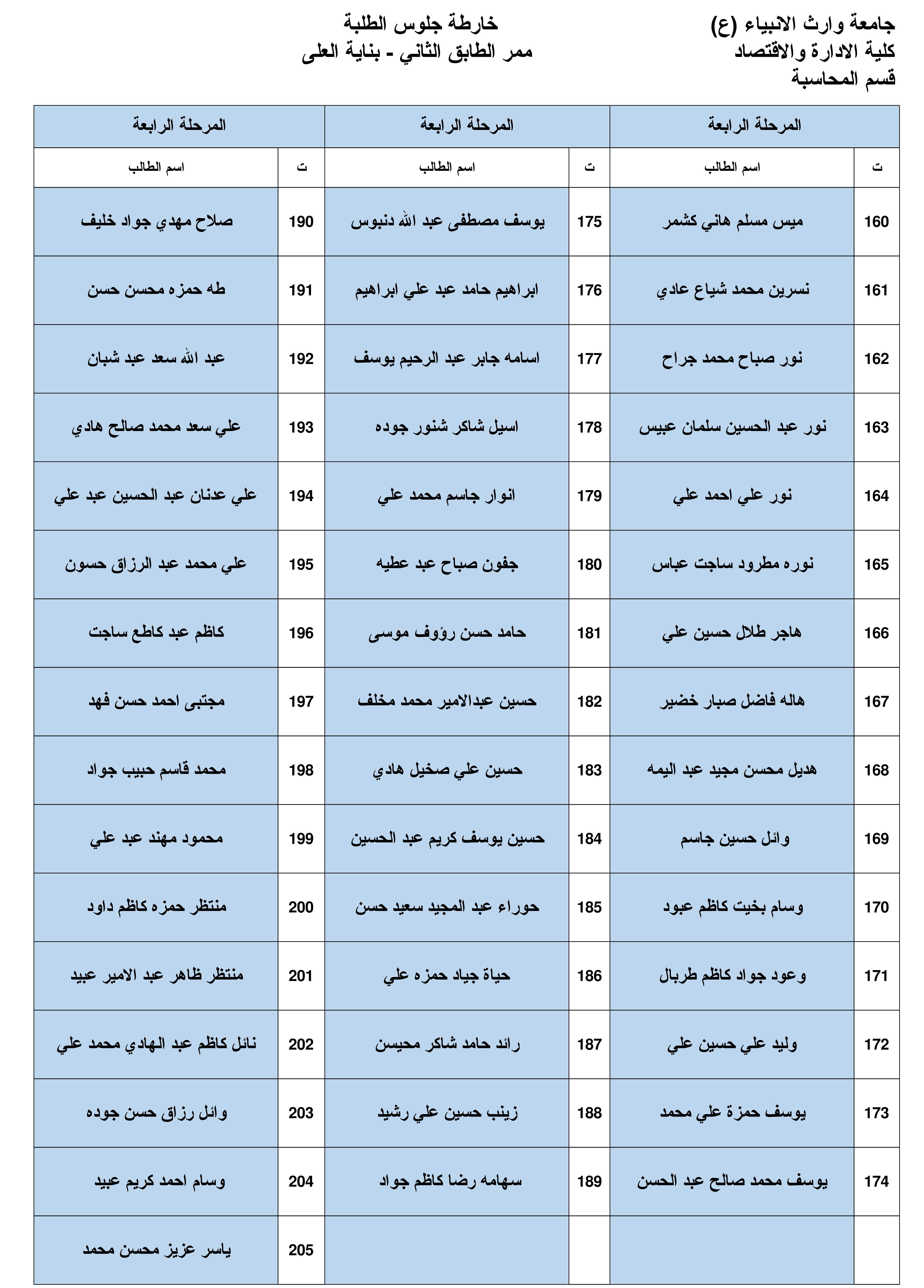 نرفق لكم خارطة الجلوس في القاعات الامتحانية لقسم المحاسبة للمرحلة الثانية والرابعة وكما موضحة في أدناه