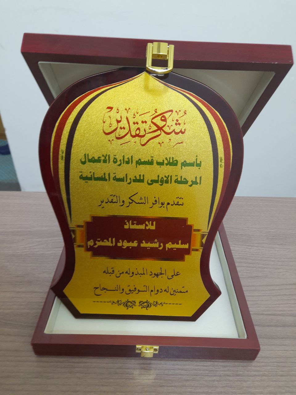 طلبة المرحلة الاولى للدراسة المسائية / قسم ادارة الاعمال يقومون بتقديم درع الشكر والتقدير الى(( م.م سليم رشيد عبود)) وذلك لجهوده المبذولة باتجاههم خلال العام الدراسي 2021-2022