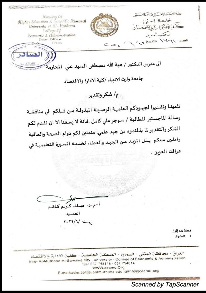 في يوم الاربعاء والمصادف ٢٢/٦/٢٠٢٢ وتجسيدا لمبدأ التؤامة و التعاون العلمي والبحثي بين مؤسسات التعليم العالي شاركت الدكتورة (هبة الله مصطفى) رئيس قسم المحاسبة في عضوية مناقشة لرسالة الماجستير الموسومة (اثر الممارسات المحاسبيه على الأداءالمالي في ظل جودة التدقيق الخارجي)، للطالبة سوجر علي كامل في جامعة المثنى كلية الادارة والاقتصاد لقسم العلوم الماليه والمصرفيه، وتألفت لجنة المناقشة من: