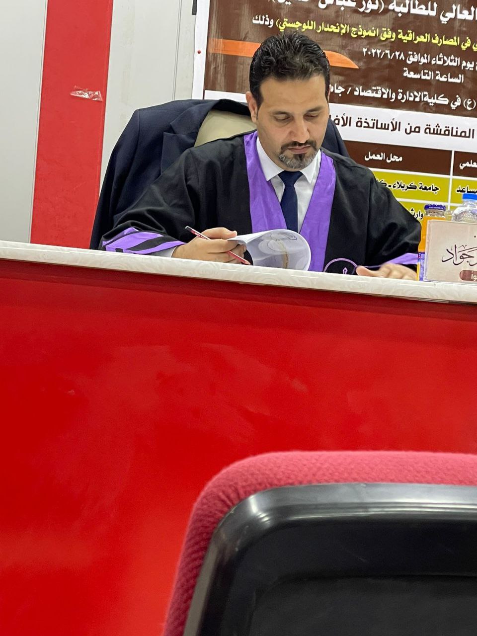 شارك رئيس قسم ادارة الاعمال الدكتور محمد مجيد الحمداني في عضوية مناقشة بحث الدبلوم العالي في جامعة كربلاء كلية الادارة والاقتصاد - قسم العلوم المالية والمصرفية في يوم الثلاثاء الموافق 28/6/2022 للبحث الموسوم ( التنبؤ بالفشل المالي في المصارف العراقية وفق انموذج الانحدار اللوجستي ) للطالبة نور عباس حسين ، وتألفت لجنة المناقشة من: