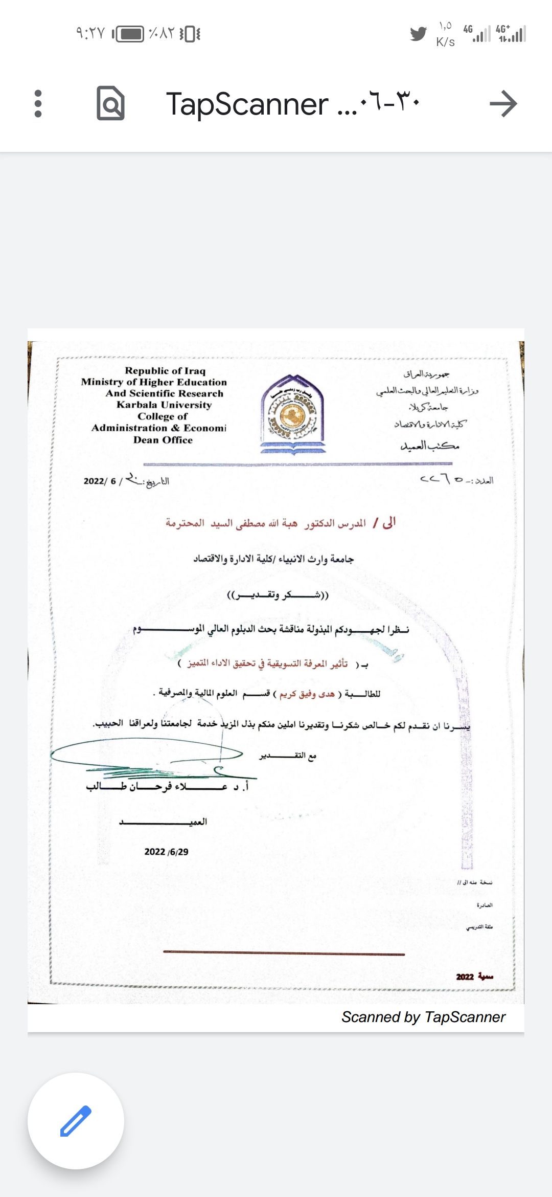 تدريسية من كلية الادارة والاقتصاد جامعة وارث الأنبياء تشترك في مناقشة بحث الدبلوم العالي في جامعة كربلاء.اشتركت رئيس قسم إلمحاسبه الدكتورة هبة الله مصطفى بمناقشة بحث الدبلوم العالي للطالبة (هدى وفيق كريم) في قسم إلعلوم الماليه والمصرفيه /ادارة مصارف والموسومة ب( تأثير المعرفة التسويقيه في تحقيق الاداء المتميز) وذلك في يوم الخميس الموافق ٣٠ حزيران 2022 فكل التوفيق والسداد للطالبة والمشرفة والسادة والسيدات أعضاء لجنة المناقشة الأفاضل .