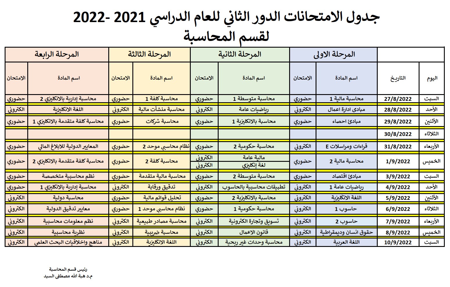 جدول امتحانات الدور الثاني لقسم المحاسبة للعام الدراسي 2021-2022