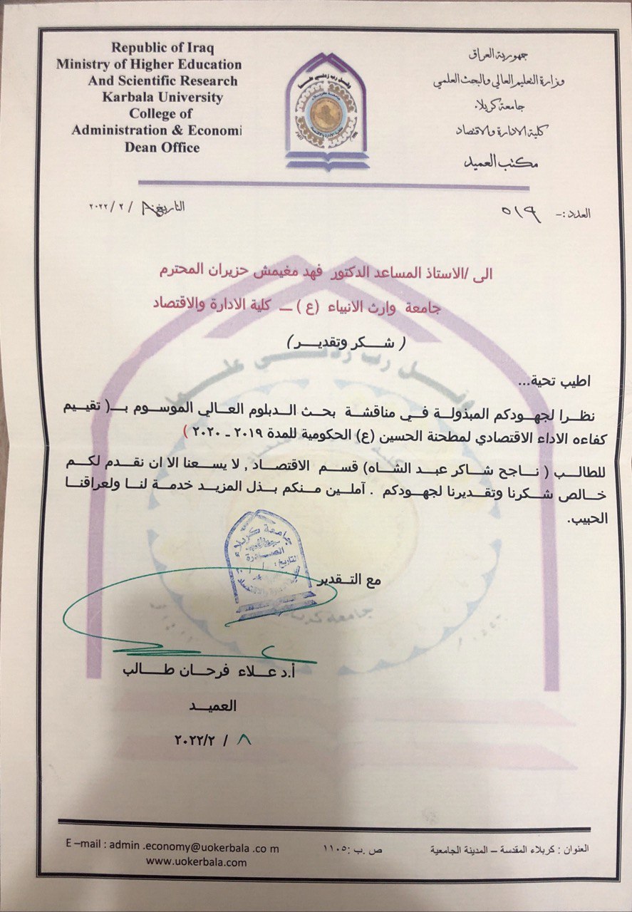 شارك الاستاذ المساعد الدكتور فهد الشمري المعاون العلمي لكليه الادارة والاقتصاد في مناقشة علميه لطالب الدبلوم من قسم الاقتصاد(ناجح شاكر عبد الشاه) عن بحثه الموسوم (تقييم كفاءة الأداءالاقتصادي لمطحنة الحسين ) وذلك في يوم الثلاثاء الموافق ٢٠٢٢/٢/٨ في جامعة كربلاء كليه الادارة والاقتصاد .