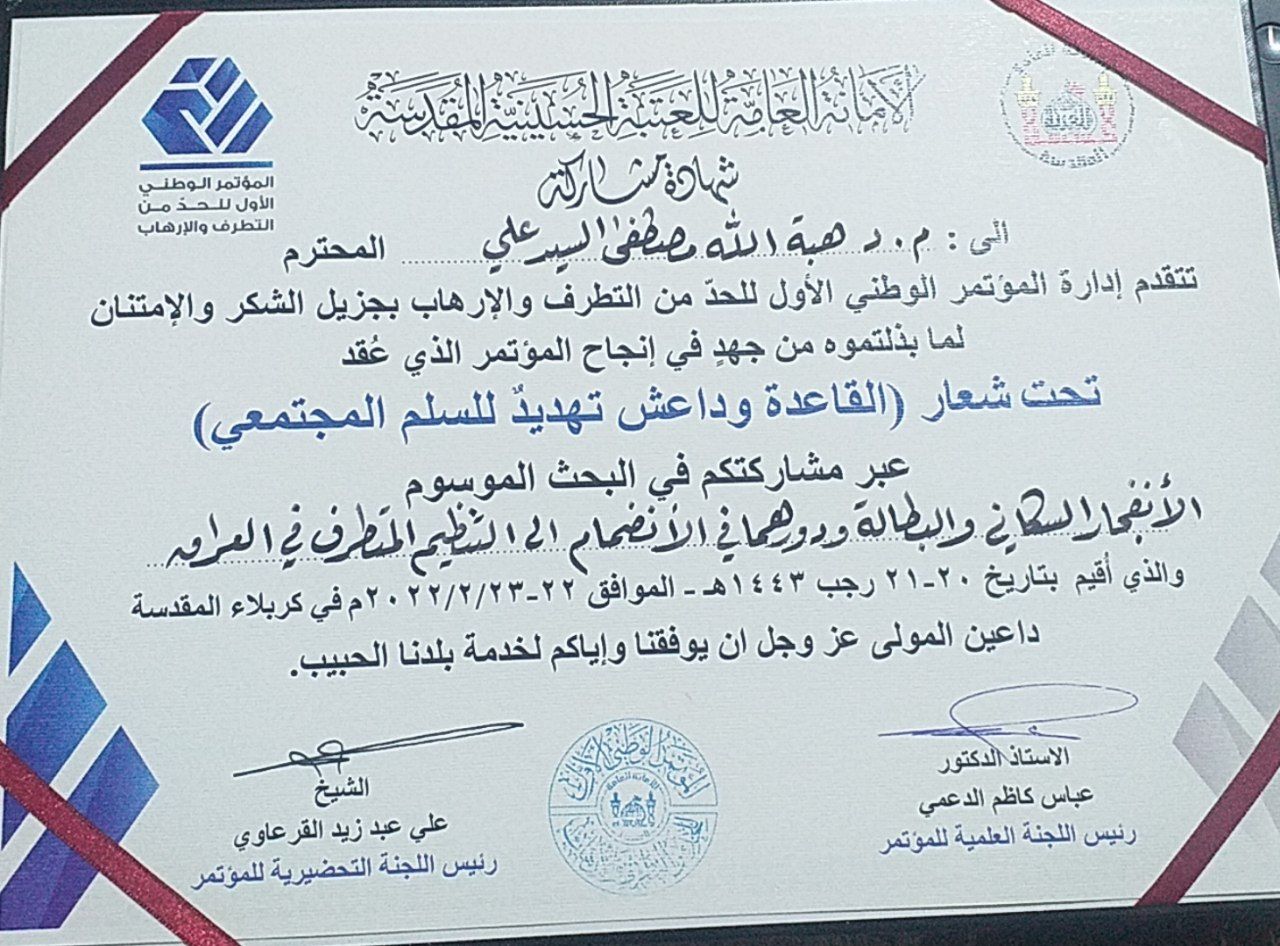 تقديرا للجهود المبذولة تم تكريم السيدة رئيس قسم المحاسبة (م.د هبة الله مصطفى السيد) بصفتها عضوا ومقررا في اللجنة العلمية بدرع السلم المجتمعي من قبل السيد رئيس اللجنة التحضيرية الشيخ؛ (علي القرعاوي) في المؤتمر الذي اقيم في العتبة الحسينية المقدسة الموسوم (المؤتمر الوطني الاول للحد من التطرف والارهاب).