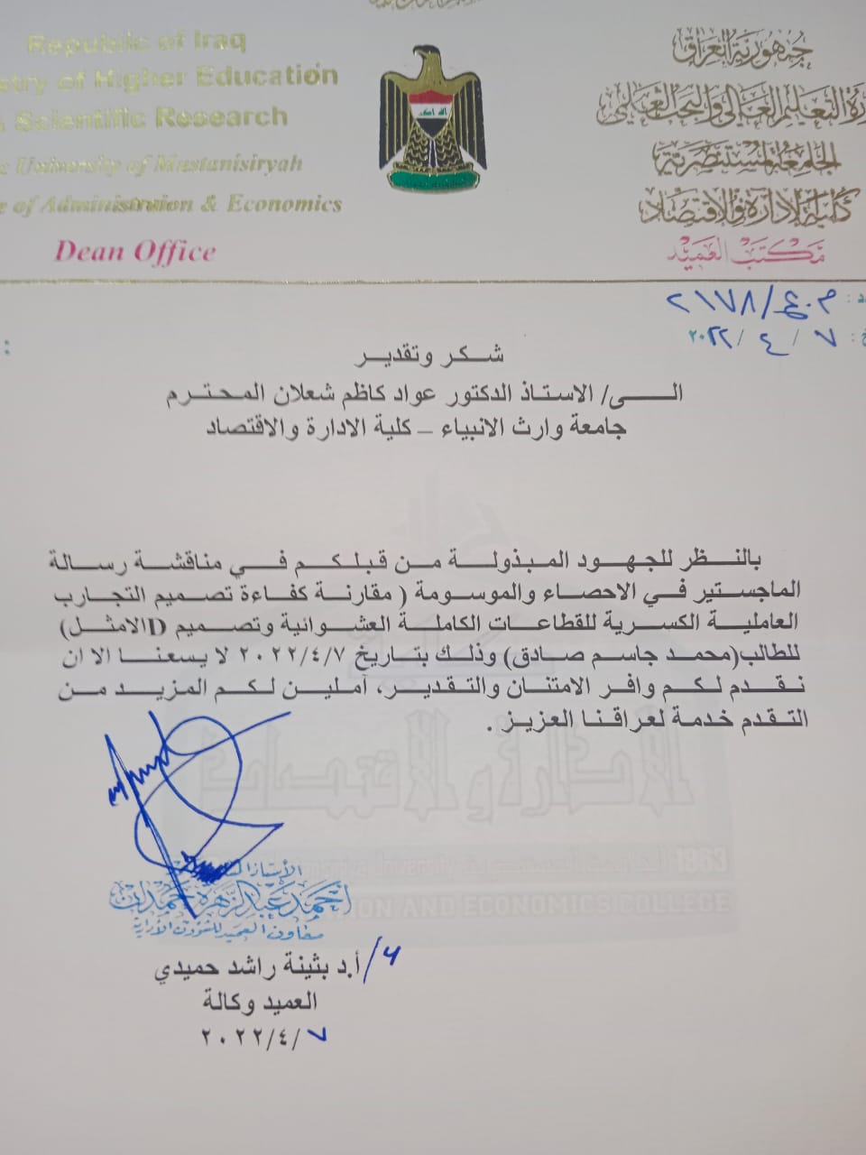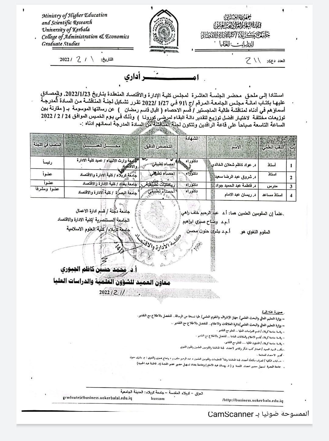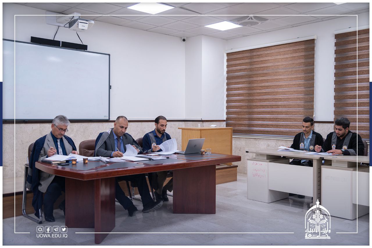 ترأس الاستاذ الدكتور عواد الخالدي عميدكليه الادارة والاقتصاد /جامعة وارث الأنبياء لجنة مناقشة علميه في قسم الاحصاء بالجامعة المستنصريه للطالب (محمد جاسم صادق)عن بحثه الموسوم (مقارنه كفاءة تصميم التجارب العاملية الكسرية للقطاعات الكاملة العشوائية وتصميم - 1 الامثل-) وذلك في يوم الخميس الموافق ٧/٤/٢٠٢٢ .