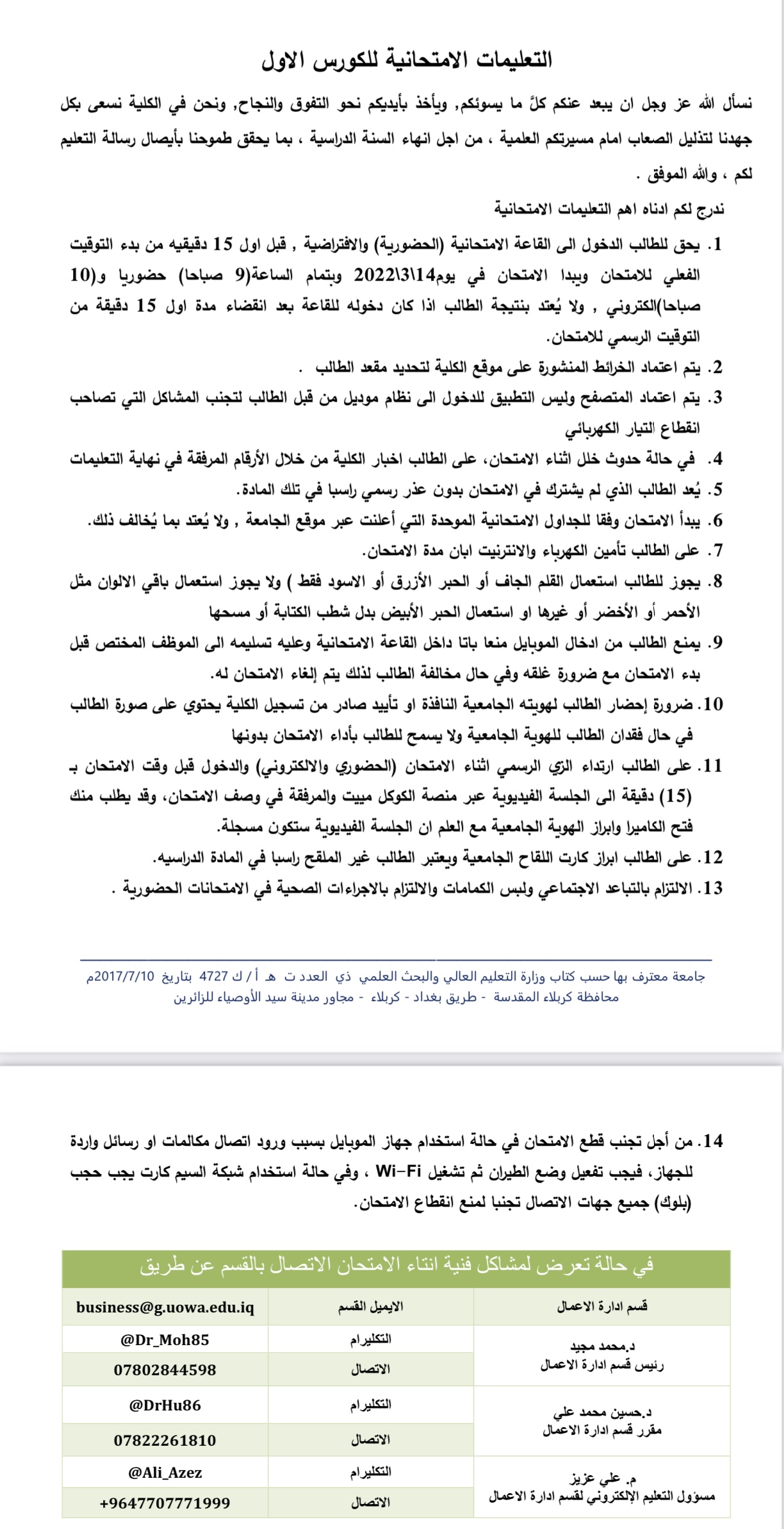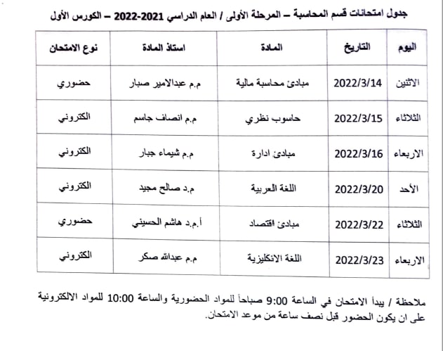 جدول الامتحانات الحضورية والالكترونية لنهاية الكورس الاول للمرحلة الاولى قسم ادارة الاعمال مع التعليمات الامتحانية