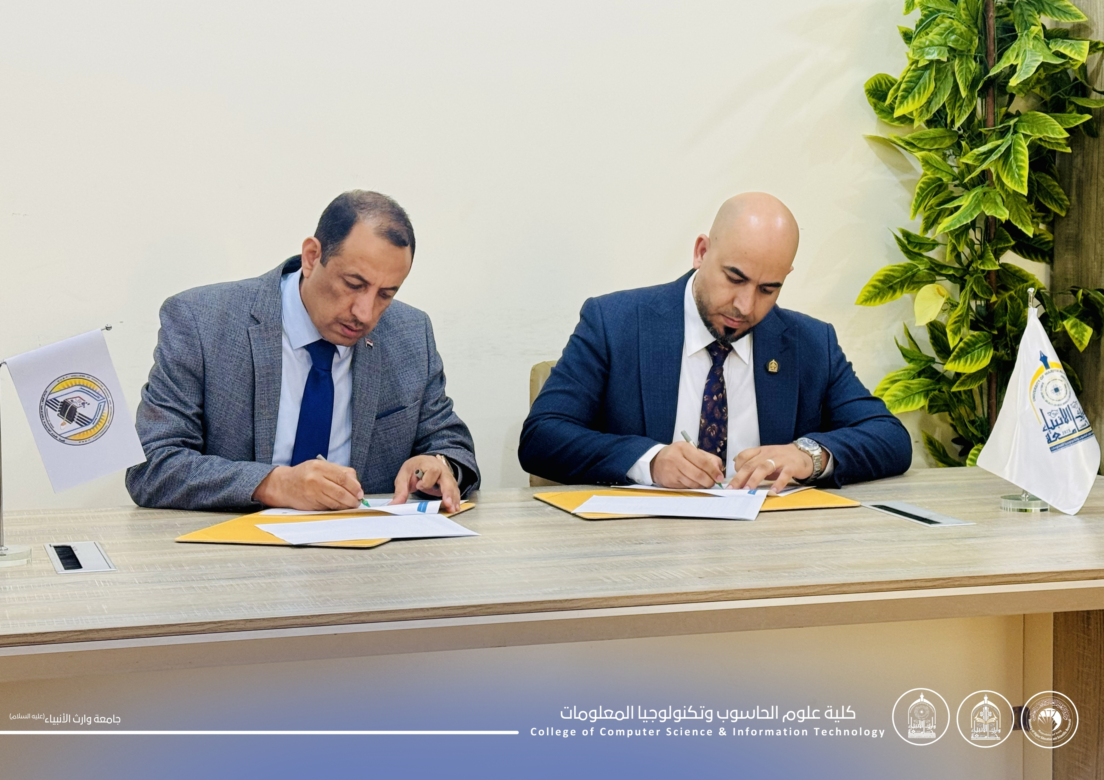 توقيع اتفاقية توأمة علمية بين كلية علوم الحاسوب وتكنولوجيا المعلومات في جامعة وارث الانبياء عليه السلام وجامعة الانبار لتعزيز التعاون الأكاديمي