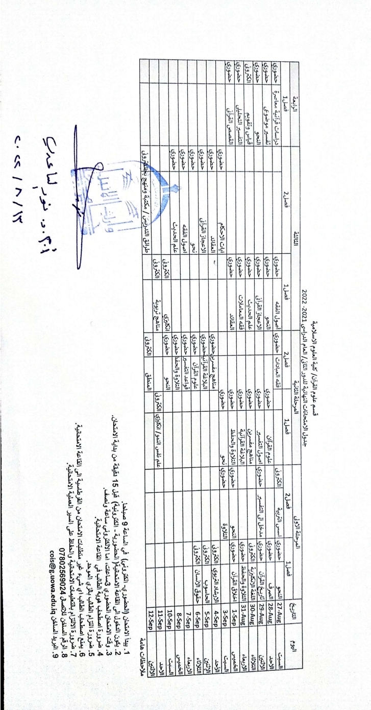 جدول الدروس الاسبوعي لقسم علوم القران للعام الدراسي 2022-2023...