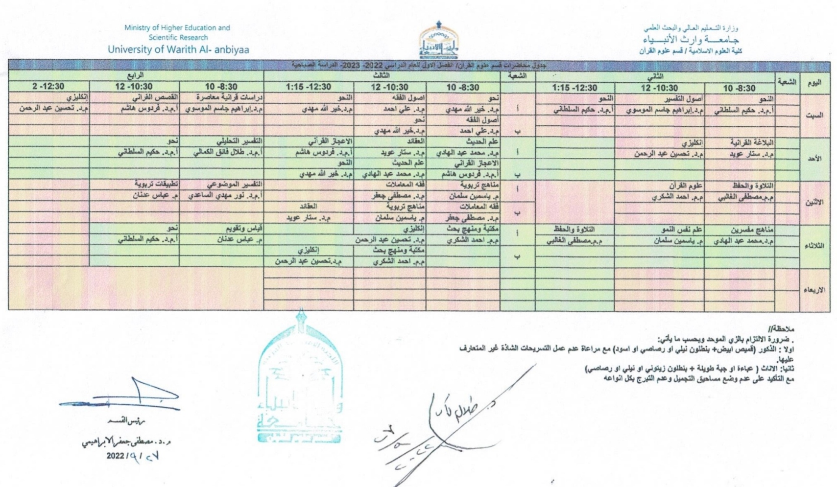 الجدول الدراسي للعام 2022-2023 لقسم علوم القران