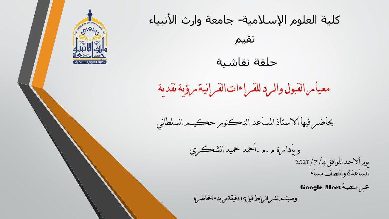 http://meet.google.com/fcp-tngi-txc  رابط الدخول الحلقة النقاشية معيار القبول والرد للقراءات القرآنية. رؤية نقدية والتي يحاضر فيها أ.م.د حكيم السلطاني