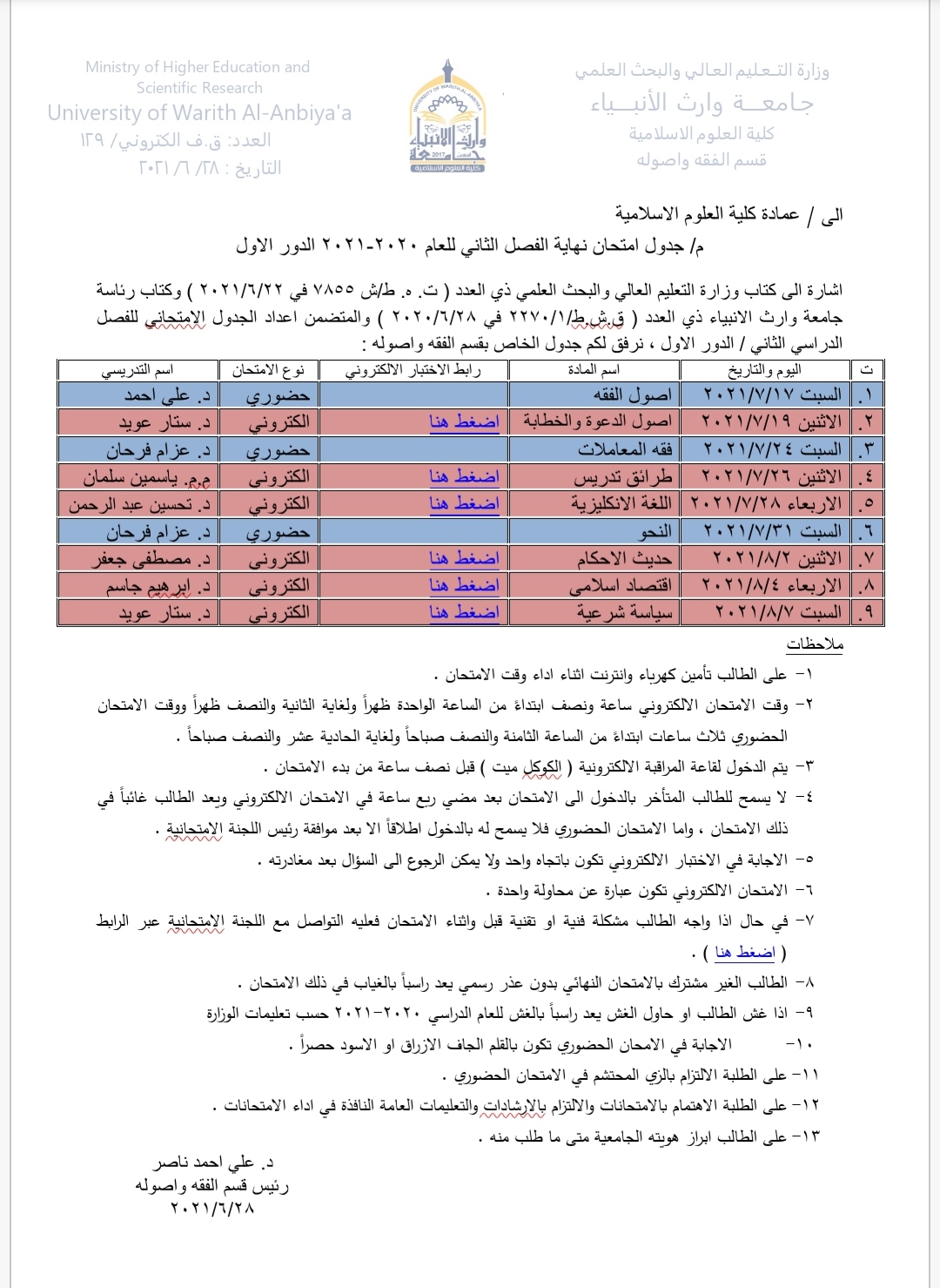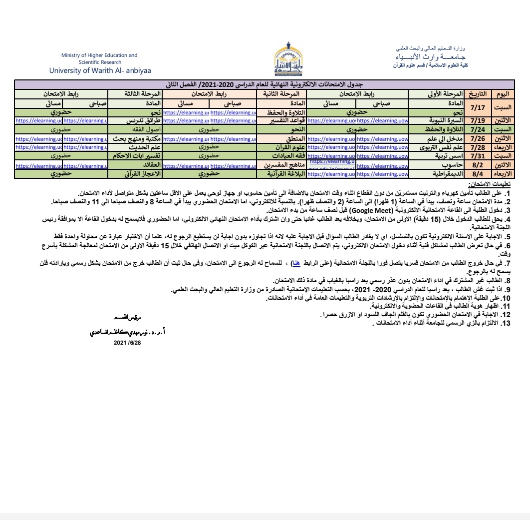 انهت اللجنة الامتحانية في كلية العلوم الإسلامية في جامعة وارث الانبياء متطلبات الامتحانات الحضورية والالكترونية والتي ستبدا من يوم السبت الموافق ١٧/ ٧