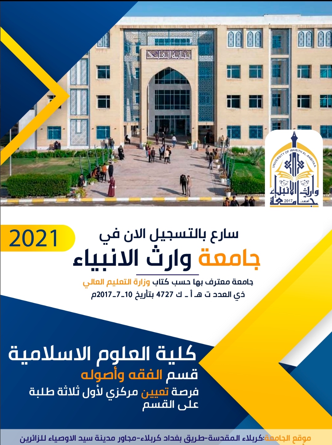 تعلن كلية العلوم الاسلامية في جامعة وارث الانبياء التابعة للعتبة الحسينية المقدسة عن قرب فتح التقديم الى اقسامها الثلاثة :