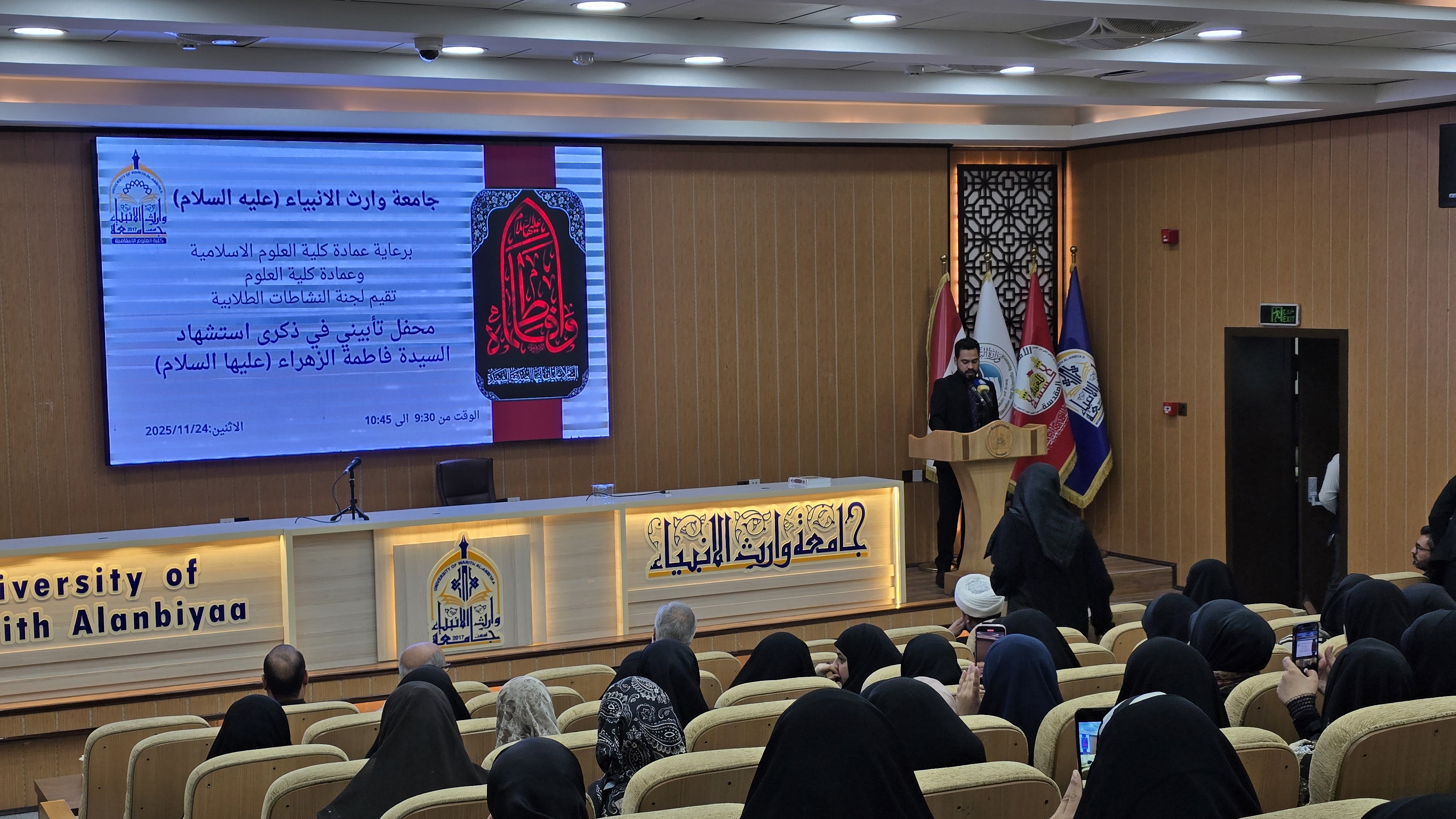 إحياء روحي ومعرفي في كلية العلوم الإسلامية بذكرى استشهاد السيدة فاطمة الزهراء (عليها السلام)أقامت كلية العلوم الإسلامية في صباح هذا اليوم حفلاً تأبينياً بذكرى استشهاد السيدة فاطمة الزهراء (عليها السلام)، بالتعاون مع كلية العلوم.استُهِلّ الحفل بتلاوة مباركة من آيات القرآن الكريم، تلتها محاضرة دينية تناولت سيرة السيدة الزهراء (عليها السلام) وما تمثّله من قدوة في الإيمان والثبات والصبر.كما تضمّن الحفل محاضرة توعوية حول قيادة الأسرة وما تبرزه هذه المواقف من قيم الصبر والتحمّل والإدارة الإنسانية للأزمات، مع ربط المفاهيم بروح المدرسة الفاطمية.وفي ختام الحفل، فُتح باب الأسئلة والنقاش مع الطلبة لتعميق الفهم وترسيخ القيم التي حملتها السيدة الزهراء (عليها السلام) في سيرتها الشريفة.