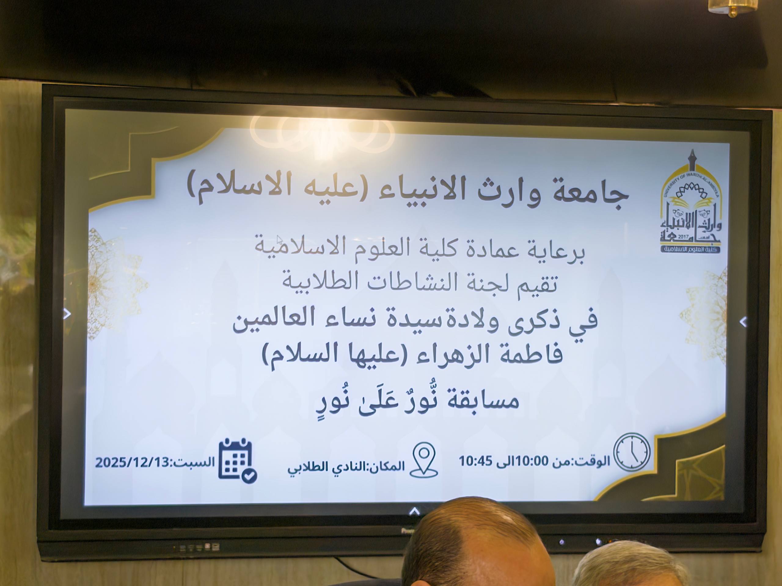 تحت رعاية كريمة من السيد عميد كلية العلوم الإسلامية المحترم، وبإشراف وتنظيم عالٍ من لجنة النشاطات الطلابية، أُقيمت مسابقة «نورٌ على نور» بمناسبة ذكرى ولادة سيدة نساء العالمين السيدة فاطمة الزهراء (عليها السلام)، وذلك في النادي الثقافي الطلابي.