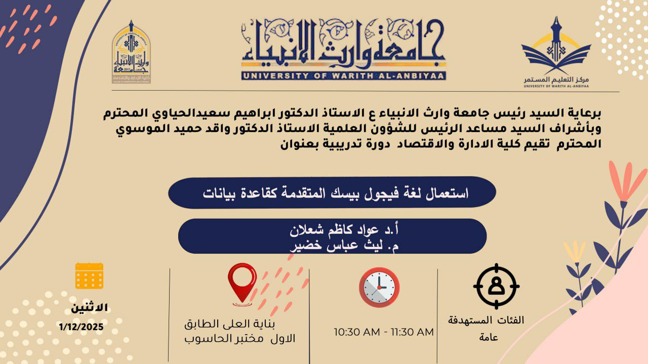 أقامت كلية الهندسة في قسم هندسة تقنيات التكييف والتبريد في جامعة وارث الانبياء (علية السلام) دورة بعنوان (تاريخ الرياضيات في العصر القديم) بواقع ثلاث ايام من 2024\2\20 ولغاية 2024\2\22 يلقيها المحاضر أ.د نهاد عبد الجليل مجيد