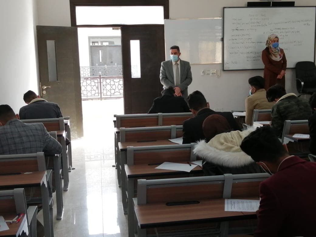 يتابع السيد العميد المحترم سير الامتحانات الالكترونية النهائية للفصل الدراسي الاول بجانب الاساتذة المراقبين واللجنة الالكترونية في داخل الكلية .