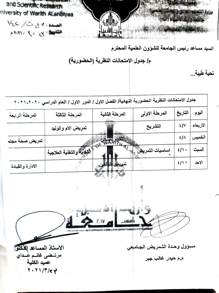 استمرار اختبار الطلبة في اسبوع الامتحانات النهائية العملية للمواد الاساسية في كلية التمريض مع اتخاذ كافة الاجراءات الوقائية اللازمة.