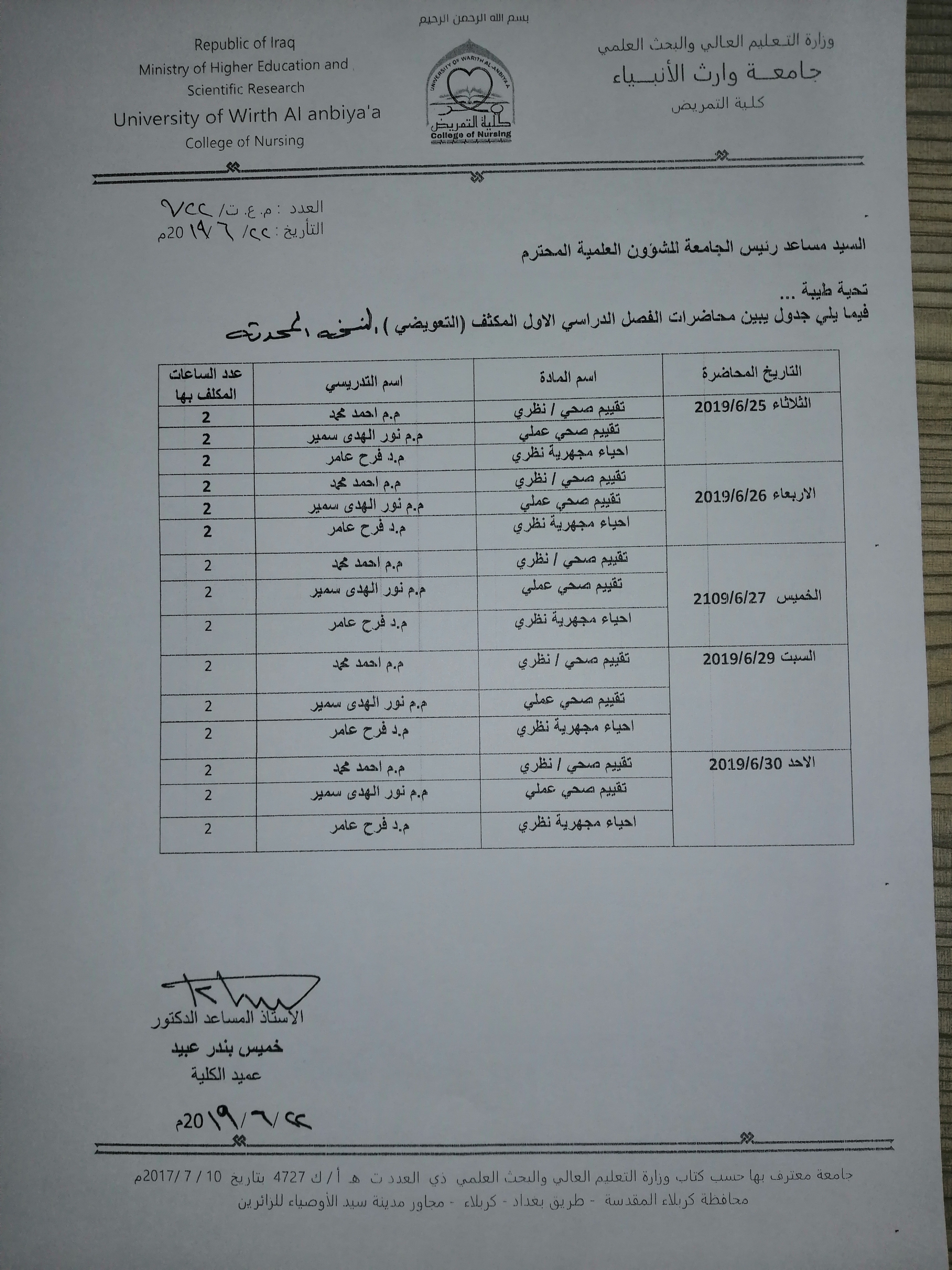 جدول محاضرات الفصل الدراسي الاول المكثف ( التعويضي)