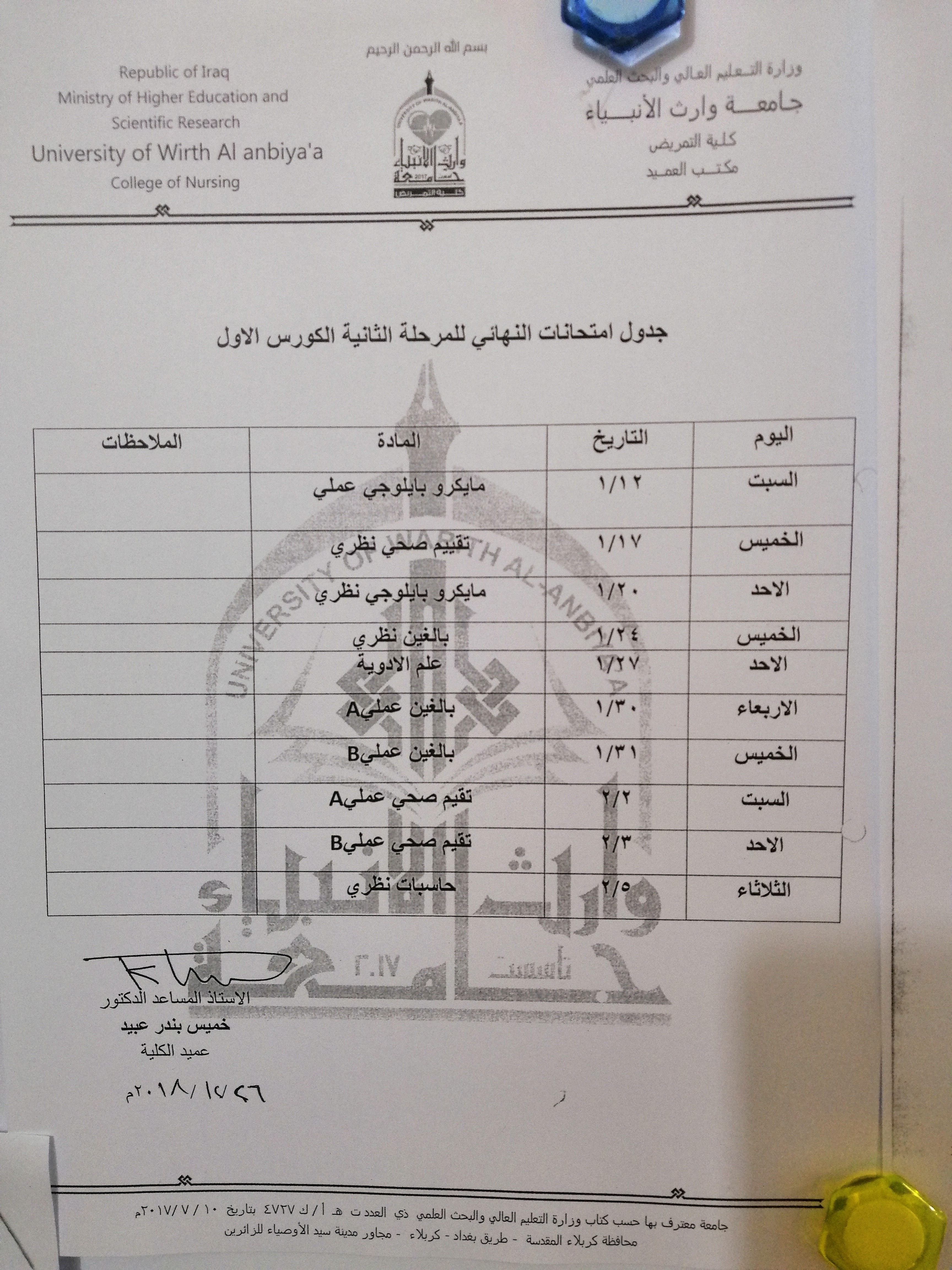 جدول امتحانات نهاية الكورس الاول للمرحلتين الاولى والثانيه