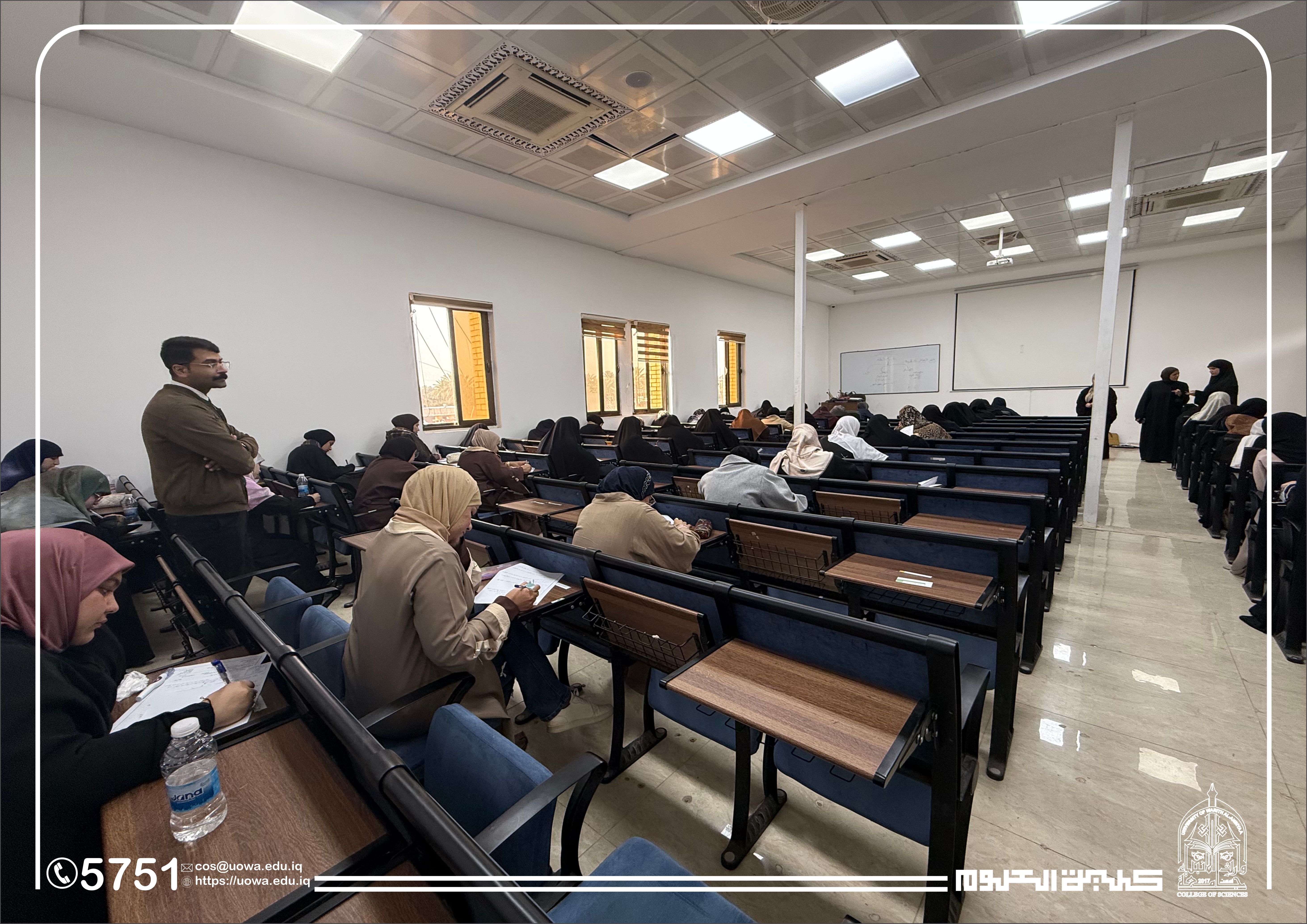 في إطار متابعته المستمرة للمسيرة العلمية وتوفير البيئة الامتحانية الملائمة، أجرى السيد عميد كلية العلوم في جامعة وارث الأنبياء (عليه السلام) جولة تفقدية للقاعات الامتحانية، وذلك لمتابعة سير امتحانات منتصف الفصل الدراسي (Midterm) لطلبة المرحلة الأولى في قسمي الفيزياء الطبية و الأدلة الجنائية.