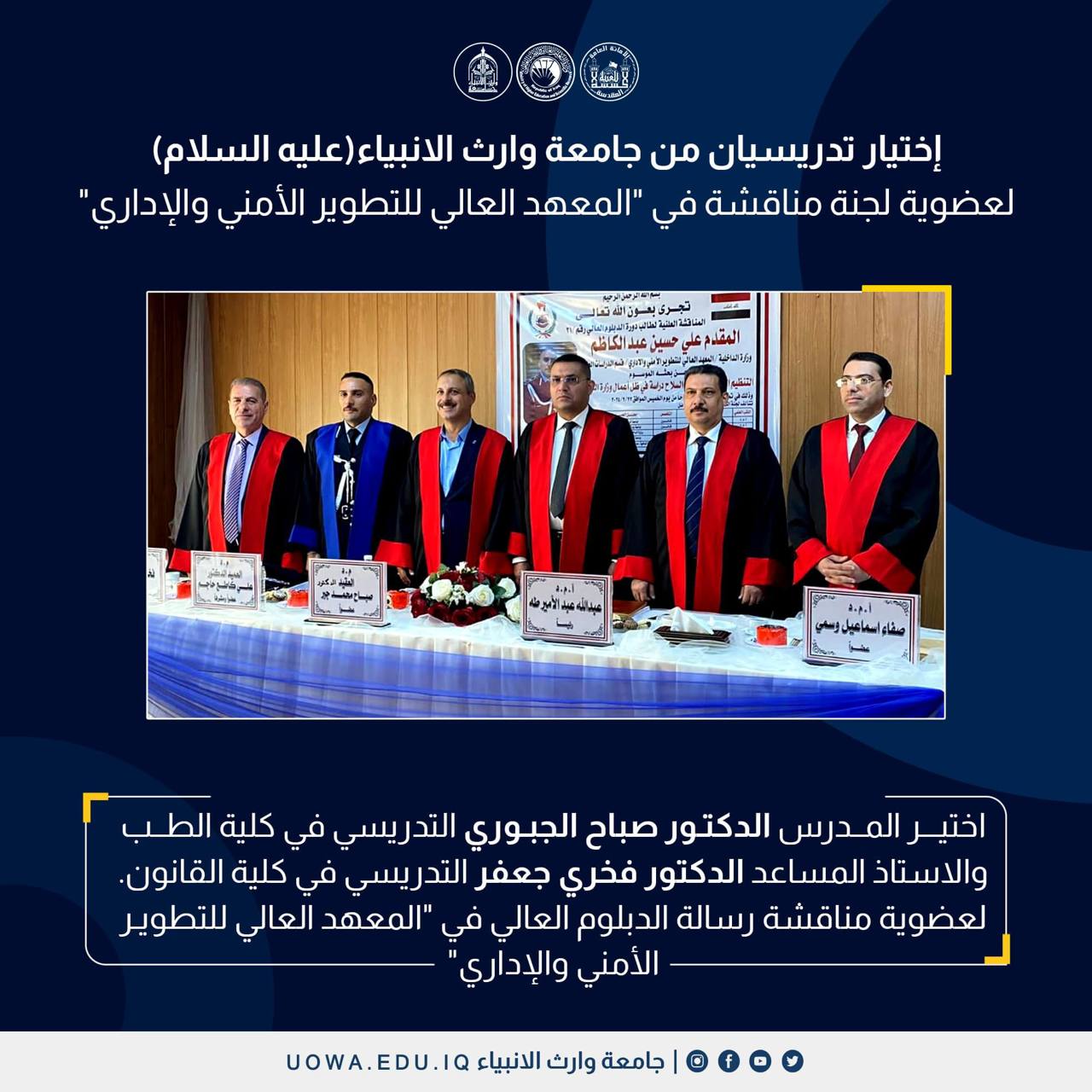 The participation of faculty members from the Faculty of Law in defending a higher diploma thesis is an important step in the student's academic journey. The student's research work is presented before a specialized academic committee to evaluate the quality of the research and its contribution to the field of specialization. This step comes to support faculty members in the areas of evaluation and scientific research.